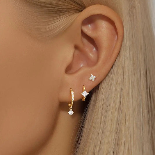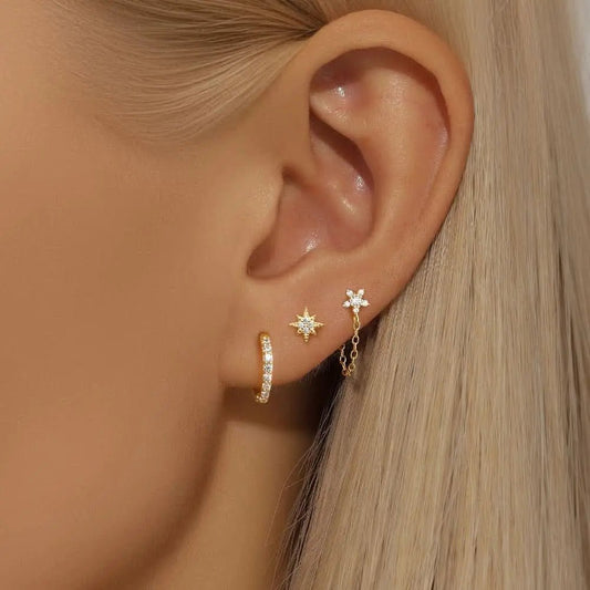 Star & Flower Zirconia Stud and Hoop Chain Earrings Set