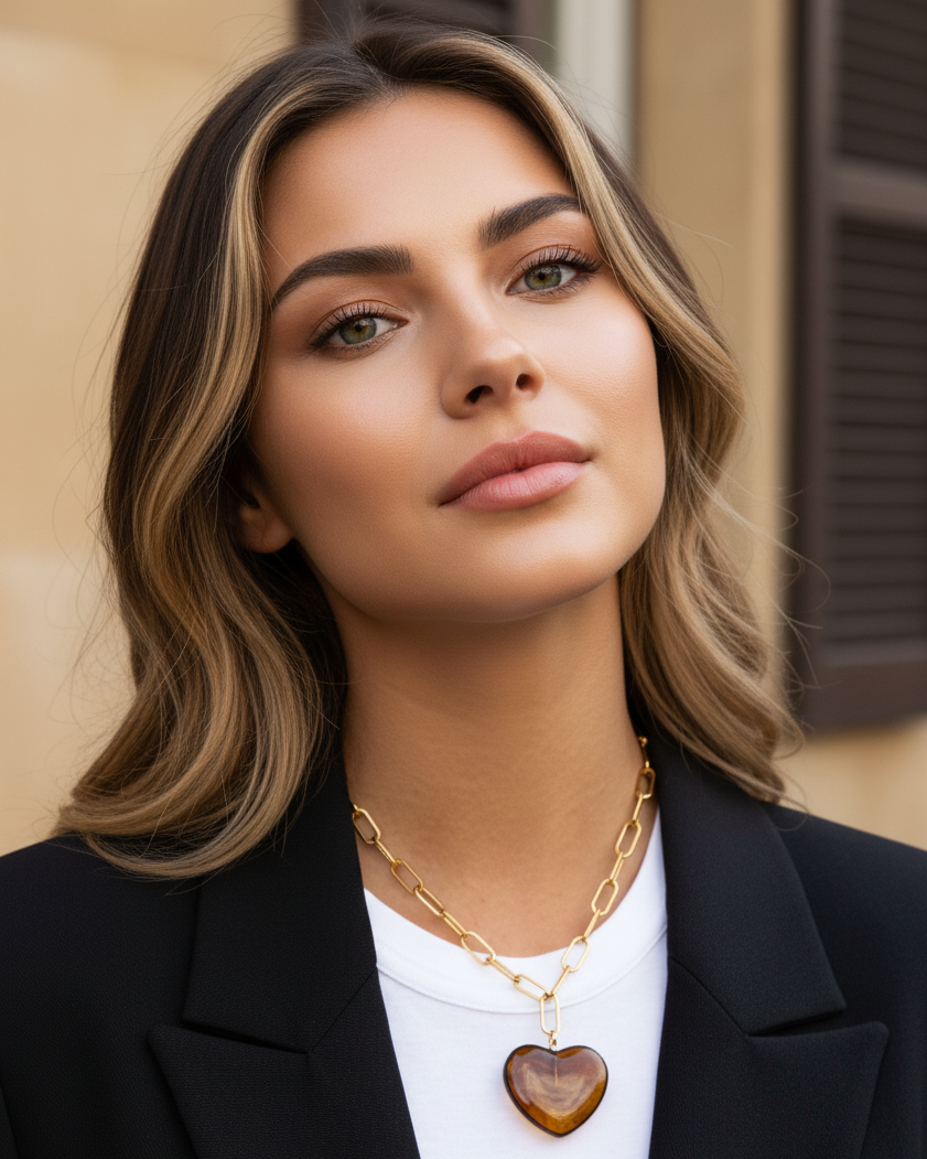 A bold golden chain, anchored by a glossy brown heart that feels warm and grounding.