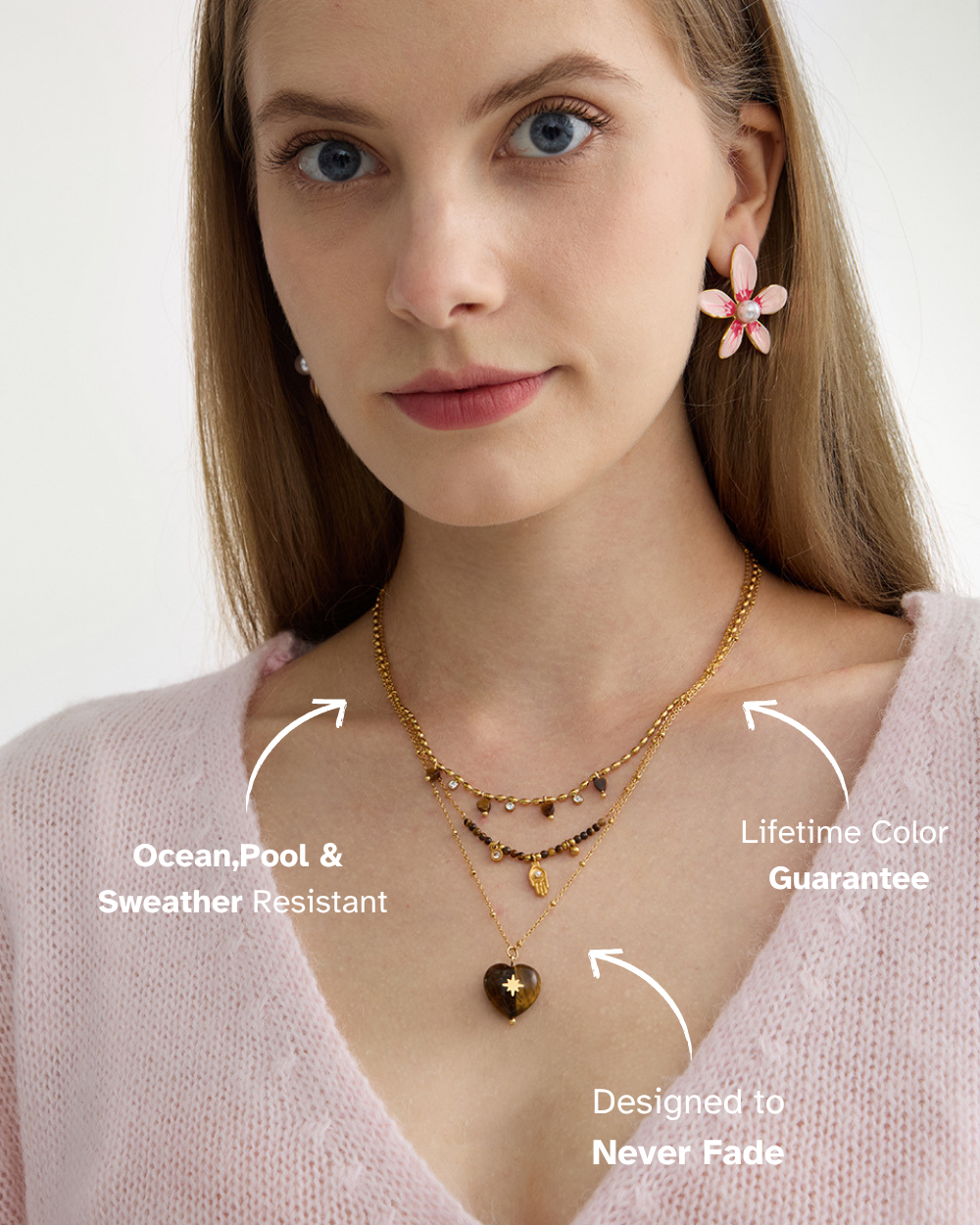 Our jewelry is 100% waterproof and designed for everyday life—you can wear it in the shower, at the pool, to the gym, or even at the beach, and it will never tarnish! ✨ We’re so confident in the lasting color and quality that we offer a lifetime warranty on all gold and silver finishes. If your piece ever tarnishes, we’ll send you a brand-new replacement—no questions asked.