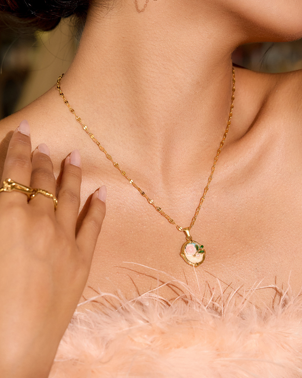 A delicate pink rose framed in golden detail, soft yet timeless.